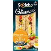Sandwich au pain de mie (50%) avec des céréales (4%) garni de poulet rôti traité en salaison (17%), de sauce caesar (17%), et d'œuf (6%).