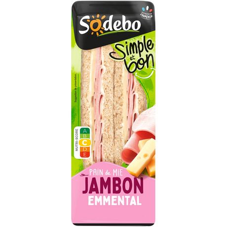 Sandwich au pain de mie (47%) garni de jambon cuit standard (28%) et d’emmental (11%).