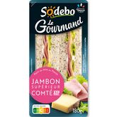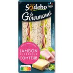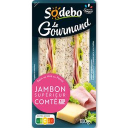Sandwich au pain de mie (53%) avec des graines de pavot (2%) garni de jambon cuit supérieur (20%) et de comté AOP (8%).