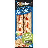Sandwich au pain suédois (55%) garni de fromage de chèvre (15%) et de tomates marinées mi-séchées (11%).