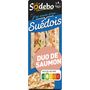 Ingrédients : Pain suédois (farines de BLE, de SEIGLE, de BLE malté et d'ORGE malté, eau, sucre, huile de colza, levure boulangère, sirop de glucose, levain de SEIGLE, germes de BLE, gluten de BLE, protéines de BLE, sel, vinaigre d’alcool), SAUMON, salade, huile de colza, BEURRE, jus de citron, eau, amidon et/ou fécule, émulsifiant : mono et diglycérides d'acides gras (végétal), conservateur : vinaigre tamponné, sel, poivre, plantes aromatiques.