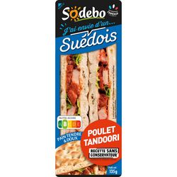 Sandwich au pain suédois (55%) garni de poulet rôti traité en salaison (25%) et d'une sauce tandoori (12%).