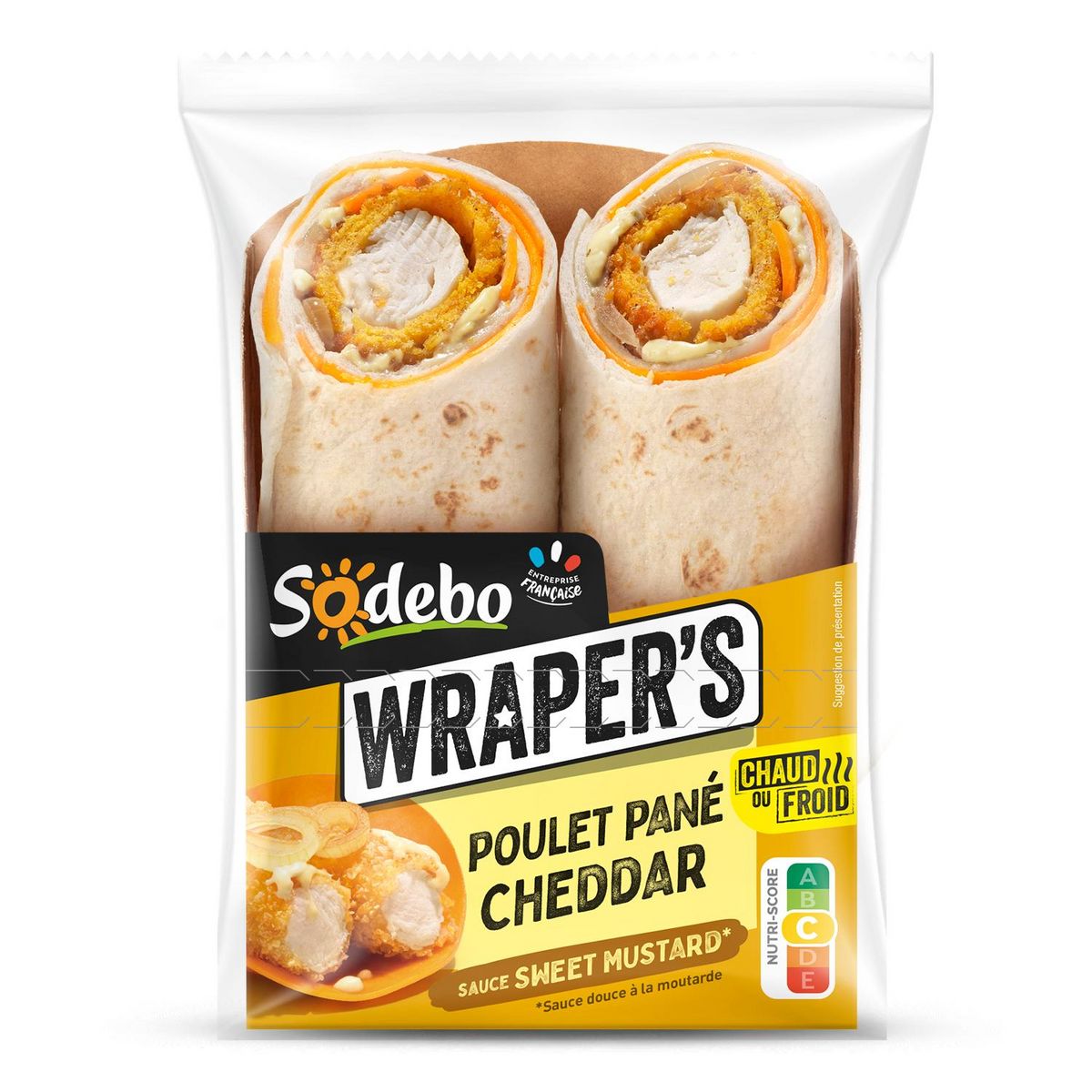 Galette de blé (44%) garnie de poulet traité en salaison pané (18%), d'une sauce (10%) avec de la moutarde (2%), de carottes (8%), de cheddar fondu (4%) et d'oignons frits (2%).