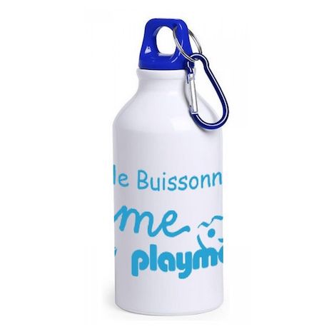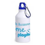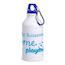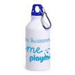 gourde en inox blanche et bouchon bleu avec un mousqueton contenance 400ml