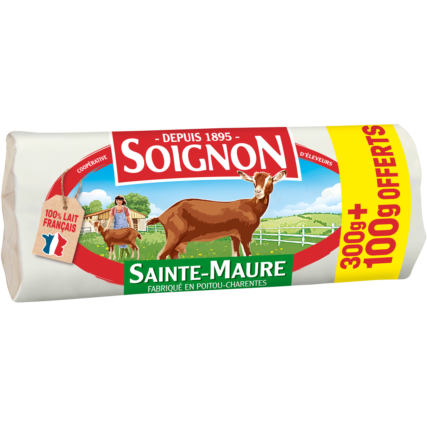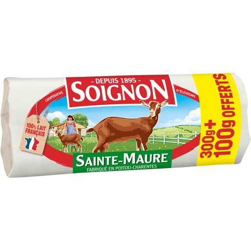 3ème référence la plus vendue au total Fromage de Chèvre ! ⦁ Le Sainte-Maure est un fromage affiné au lait pasteurisé, fabriqué dans le respect du savoir-faire et de la qualité Soignon. ⦁ Sa couleur blanche, sa texture fine et fondante, son goût franc et typique. ⦁ Du lait de chèvre 100% français, issu des producteurs de notre coopérative.