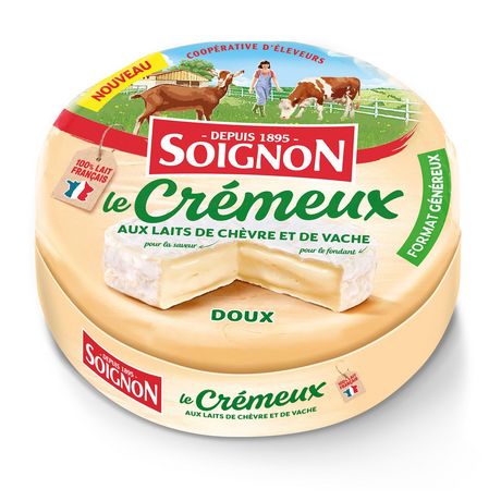 Découvrez le CRÉMEUX de SOIGNON. Un fromage doux au fondant incomparable, inspiré d'une recette régionale du Poitou alliant lait de chèvre et lait de vache. Le lait de chèvre, pour ses saveurs aromatiques, et le lait de vache pour la douceur et le fondant en bouche. Ce fromage à pâte molle est fabriqué dans notre fromagerie de Dangé Saint-Romain, au cœur du Poitou, avec du bon lait de chèvre et de vache 100% français. Avec son format familial à un prix accessible, le CRÉMEUX DE SOIGNON se partage au quotidien, en famille ou entre amis. Il est vendu dans un papier fromager et sur un socle carton.