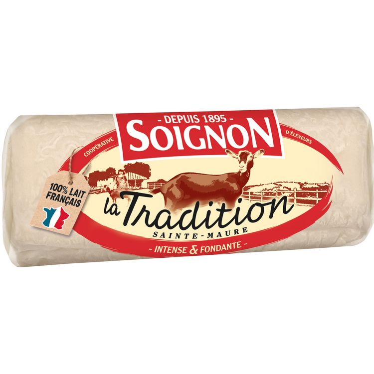 ⦁ La 9ème bûche de chèvre la plus vendue ⦁ Le Sainte-Maure est un fromage affiné au lait pasteurisé, fabriqué dans le respect du savoir-faire et de la qualité Soignon. ⦁ Sa couleur blanche, sa texture fine et fondante, son goût franc et typique. ⦁ Du lait de chèvre 100% français, issu des producteurs de notre coopérative.