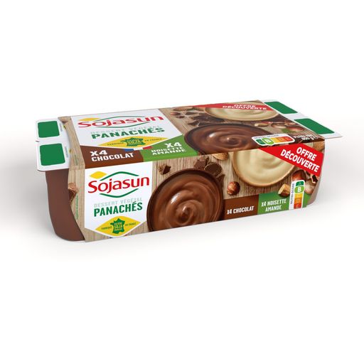 Parfum noisettes amandes : Jus de SOJA 83% (eau, graines de SOJA7,5%), sucre, pâte de PRALINE 4% (sucre, NOISETTES torréfiées 1,2%, AMANDES torréfiées 0,8%, huiles d’AMANDEet de NOISETTE), épaississants : amidon transformé de maïs sans OGM – pectines – carraghénanes – farine de graines de guar, arôme,