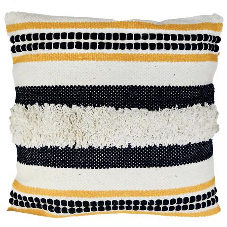 Coussin en Macramé (technique de tissage de noeuds avec de la ficelle, tissu ou cordes ), au design actuel et tendance, idéal pour donner un côté un peu ethnique et chaleureux à votre décoration. Finition: Fermture à Zip. Couleur: Ecru, noir et jaune. Composition: - enveloppe 100 % coton. - garnissage: 100% polyester. Dimensions : 45x45 cm. Entretien: Lavage en machine à froid. Ne pas utiliser de javel, pas de séchage au sèche linge, ni pressing.