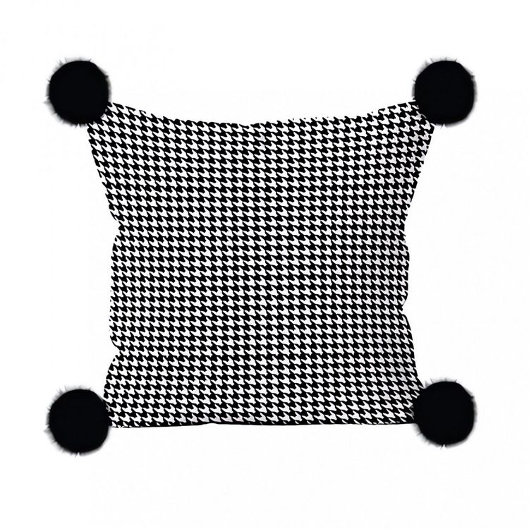 Coussin ultra doux en polaire microfibre au motif pied de poule. Finition: Fermeture à Zip. 4 pompons. Couleur: Noir et blanc. Composition: - enveloppe: 100% polyester microfibre - garnissage: 100% polyester. Dimensions: 45x45 cm Entretien: Lavage en machine à 30 degrès.