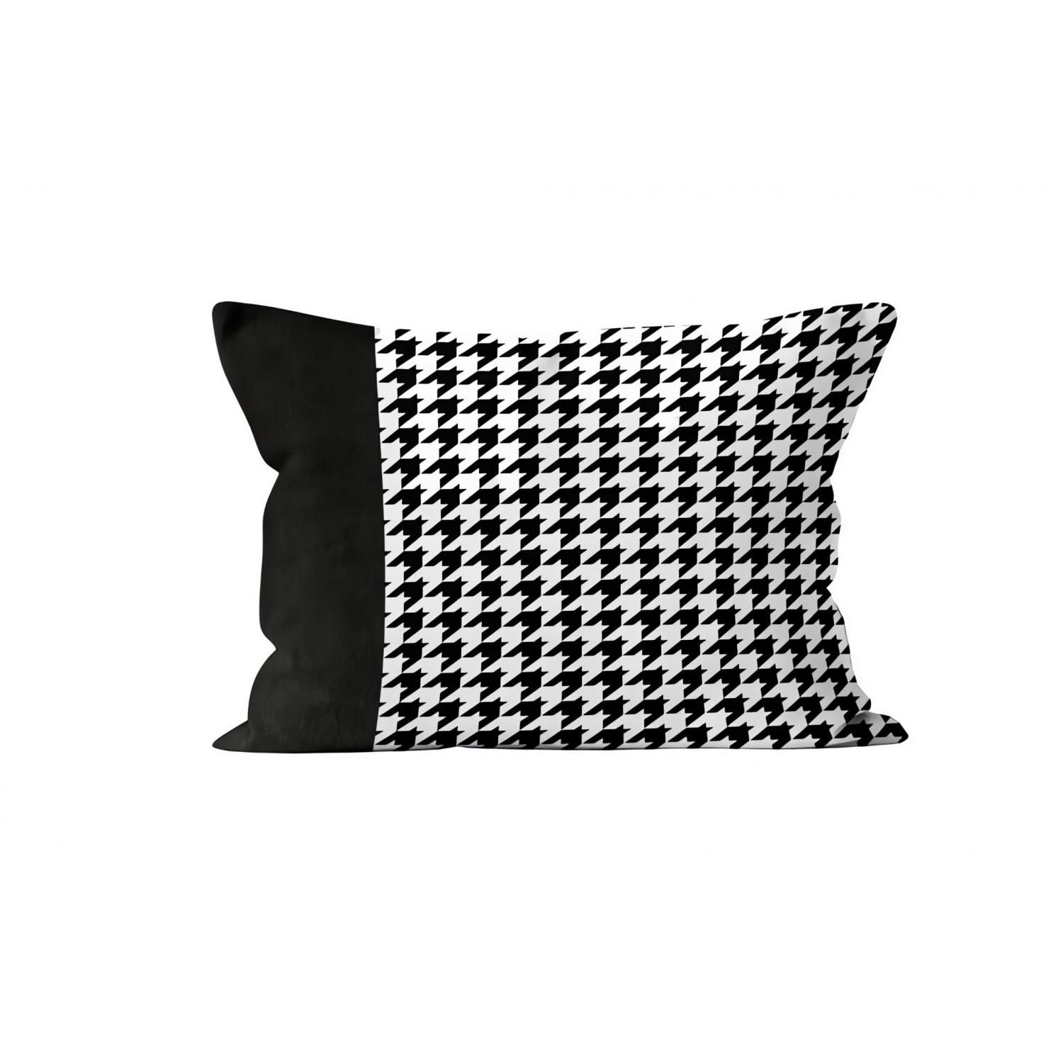 En savoir +Coussin en pur coton au motif pied de poule et doté d'une bande en velours. Finition: Fermeture à zip. Imprimé double face. Couleur: Blanc et noir. Composition: - enveloppe: 100 % coton avec bande en velours coton - garnissage: 100% polyester. Dimensions: 32x50 cm. Entretien: Lavage à froid en machine.
