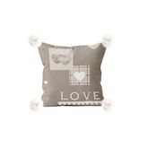 Coussin ultra doux en polaire microfibre pour une atmosphère romantique. Finition: Fermeture à Zip. 4 pompons. Couleur: Taupe et blanc. Composition: - enveloppe: 100% polyester microfibre - garnissage: 100% polyester. Dimensions: 45x45 cm Entretien: Lavage en machine à 30 degrès.