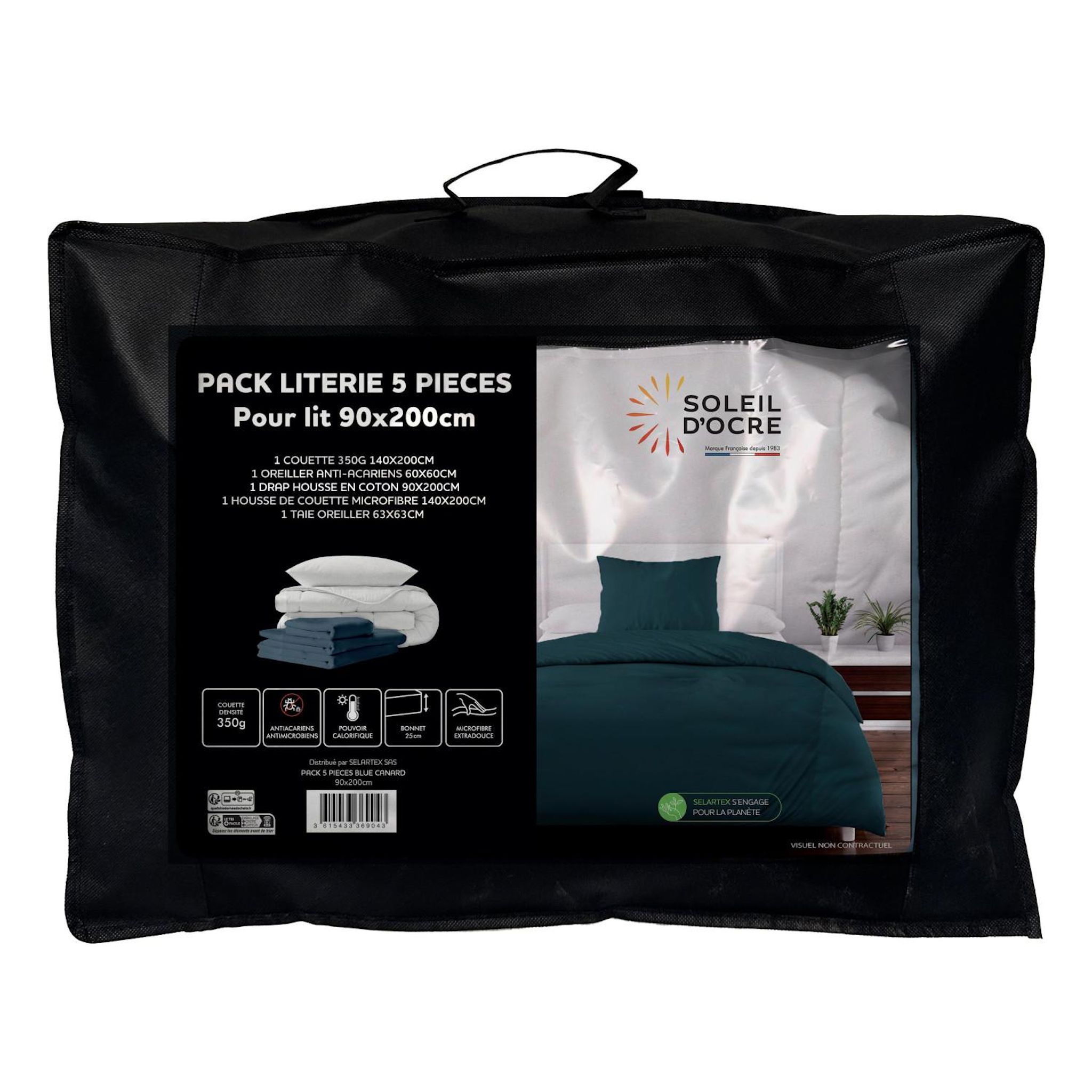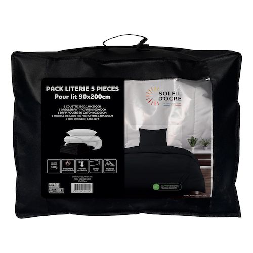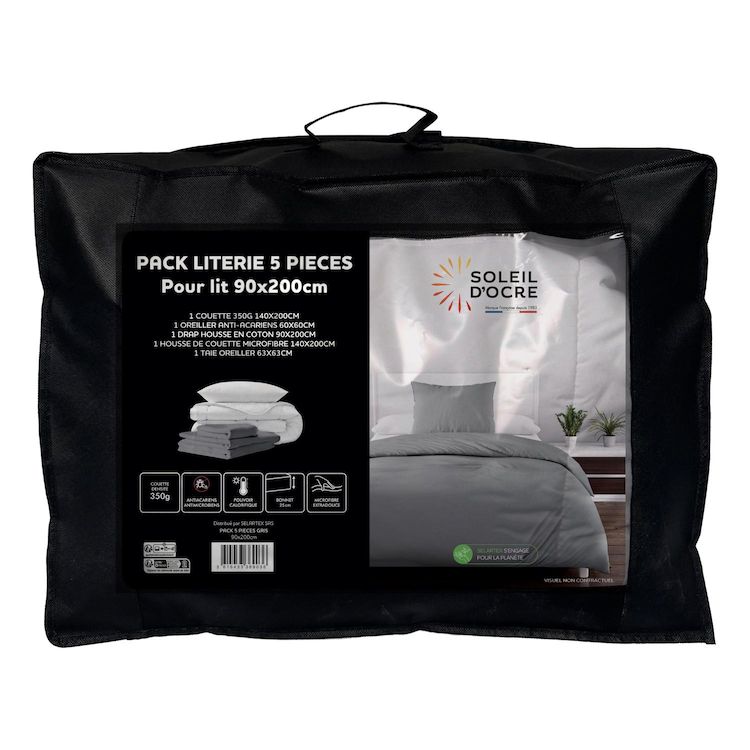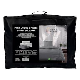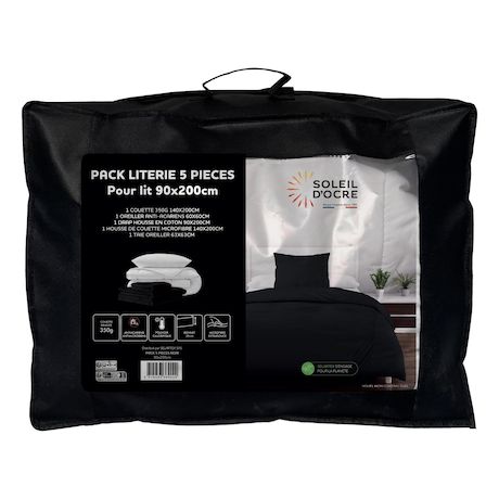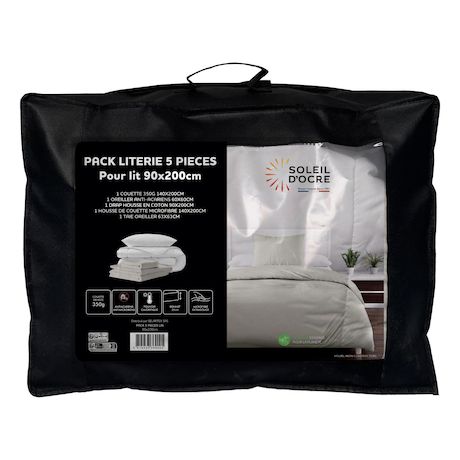 Pack complet de literie pour lit 1 place en 90x200 cm (5 Pieces). Prix malin. Se compose de: - 1 Couette blanche DOUCEUR 140x200 cm (Enveloppe: microfibre, 350 gr). - 1 Oreiller blanc CONFORT 60x60 cm Anti-acarien (Enveloppe: microfibre, Garnissage: fibre creuse siliconnée 550 Gr). - 1 Drap housse 90x200 cm (100% coton 57 Fils), Bonnet de 30 cm. - 1 Housse de couette 140x200 cm en microfibre lavée, très douce (Entretien facile, repassage inutile), finition boutons. - 1 Taie d'oreiller 63x63 cm en microfibre lavée, très douce (Entretien facile, repassage inutile).