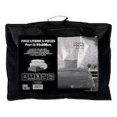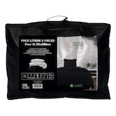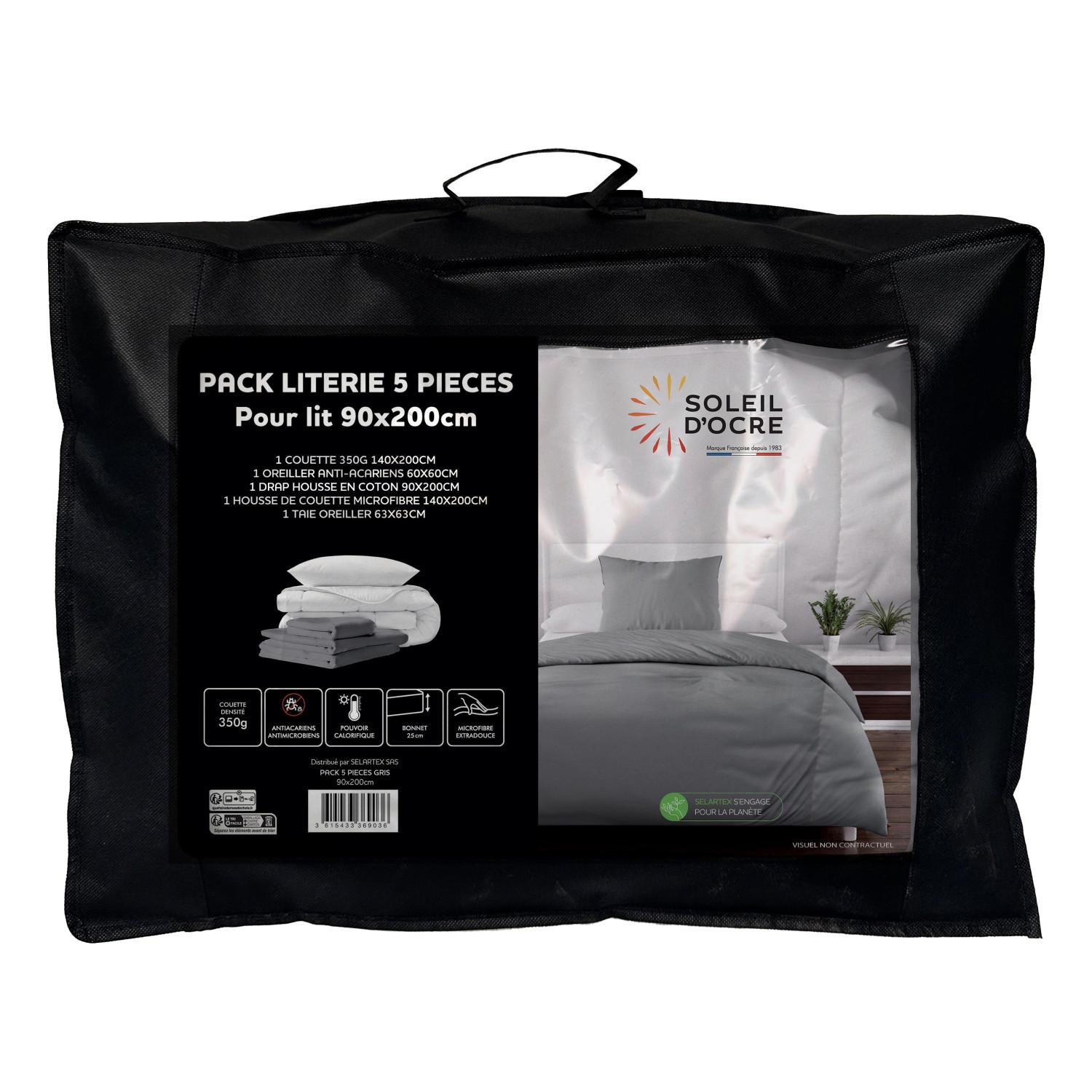Pack complet de literie pour lit 1 place en 90x200 cm (5 Pieces). Prix malin. Se compose de: - 1 Couette blanche DOUCEUR 140x200 cm (Enveloppe: microfibre, 350 gr). - 1 Oreiller blanc CONFORT 60x60 cm Anti-acarien (Enveloppe: microfibre, Garnissage: fibre creuse siliconnée 550 Gr). - 1 Drap housse 9