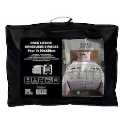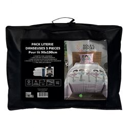 Pack complet de literie pour lit 1 place en 90x190 cm (5 Pieces). Prix malin. Couleur: Rose. Se compose de: - 1 Couette blanche DOUCEUR 140x200 cm (Enveloppe: microfibre, 350 gr). - 1 Oreiller blanc CONFORT 60x60 cm Anti-acarien (Enveloppe: microfibre, Garnissage: fibre creuse siliconnée 550 Gr). - 1 Drap housse 90x190 cm ZZZ blanc (55% polyester, 45% coton), Bonnet de 25 cm.. - 1 Housse de couette imprimée rose 140x200 cm en coton 57 Fils/cm2, finition bouteille. - 1 Taie d'oreiller rose 63x63 cm en coton 57 Fils/cm2 (dessin placé).