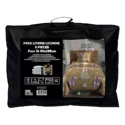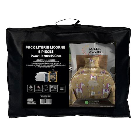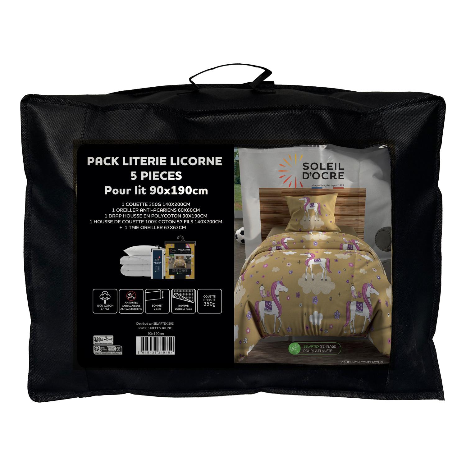 Ensemble couette et parure 5 Pièces LICORNES jaune pour lit en 90x190 cm, par Soleil d'ocre