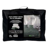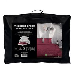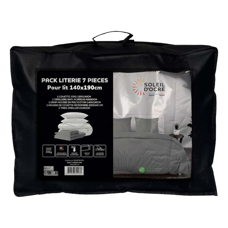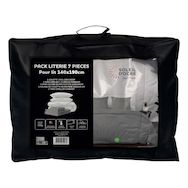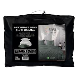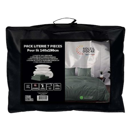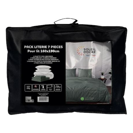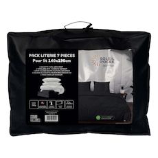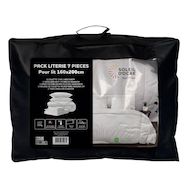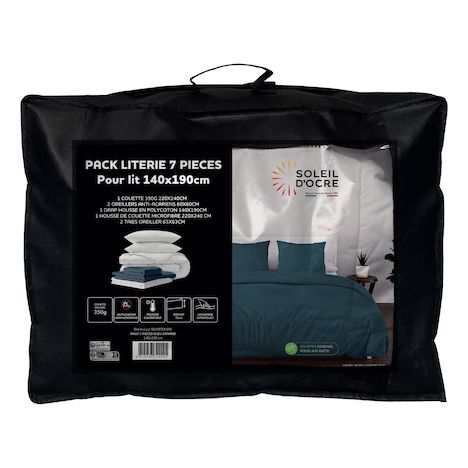 Pack complet de literie pour lit 2 places (7 Pieces). Prix malin. Se compose de: - 1 Couette blanche DOUCEUR (Enveloppe: microfibre, 350 gr). - 2 Oreillers blancs CONFORT 60x60 cm Anti-acarien (Enveloppe: microfibre, Garnissage: fibre creuse siliconnée 550 Gr). - 1 Drap housse ZZZ (55% polyester, 45% coton), Bonnet de 25 cm. - 1 Housse de couette en microfibre lavée, très douce (Entretien facile, repassage inutile), finition boutons. - 2 Taies d'oreiller 63x63 cm en microfibre lavée, très douce (Entretien facile, repassage inutile).