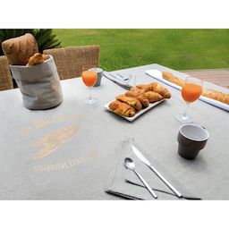 Une nappe à l'impression 'baguette' dorée qui sent bon la campagne. Elle apportera àvotre cuisine ou votre salon une touche champêtre. Traitement anti-tâches Composition : 100% coton