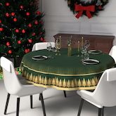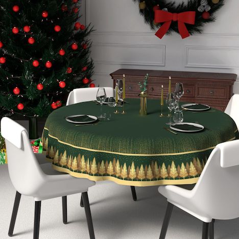Nappe festive imprimée anti-tâches carrée, traitement waterproof. Couleur: Vert et doré. Composition: 100% polyester. Entretien: - entretien facile, repassage inutile. - lavage 30 °C.