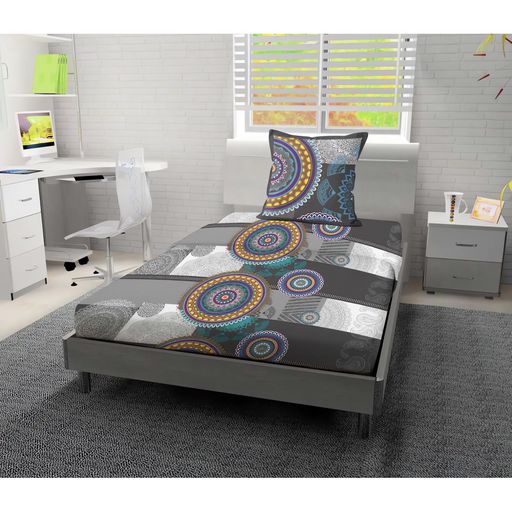 Lit 1 place en 90x190 cm au motif fantaisie et coloré. Dimension: - 1 drap housse 90x190 cm - 1 drap plat 180x290 cm - 1 taie d'oreiller placée 63x63 cm. Composition: 100% coton 52 fils/cm2, fibres naturelles