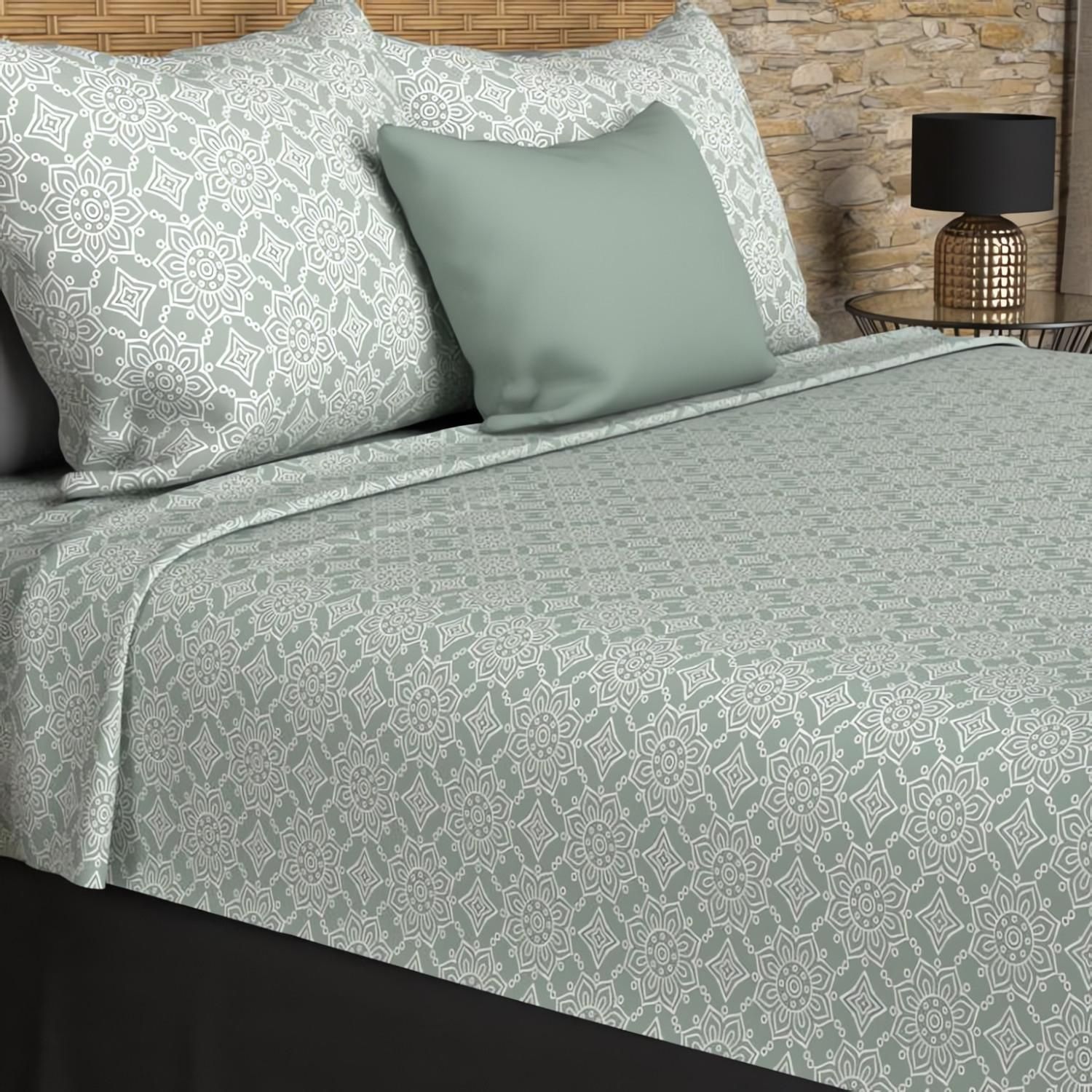 Parure de lit imprimée en pure coton pour lit 2 personnes. Qualité supérieure, tissage serré. Composition: - 100 % coton 57 fils/cm2. Parure de lit: - 1 drap plat - 1 Drap housse (bonnet 25 cm) - 2 taies d'oreiller dessin placé 63x63 cm. Entretien: - Entretien facile - Lavage 40° en machine