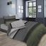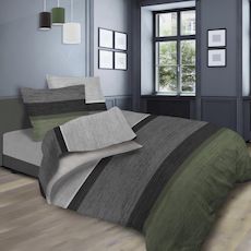 Parure de lit imprimée en pure coton pour grand lit 2 personnes. Qualité supérieure, tissage serré. Couleur: - Rayures: kaki, gris, anthracite Composition: - 100 % coton 57 fils/cm2. Parure de lit: - 1 drap plat 260x300 cm. - 1 Drap housse 160x200 cm (bonnet 25 cm). - 2 taies d'oreiller dessin placé