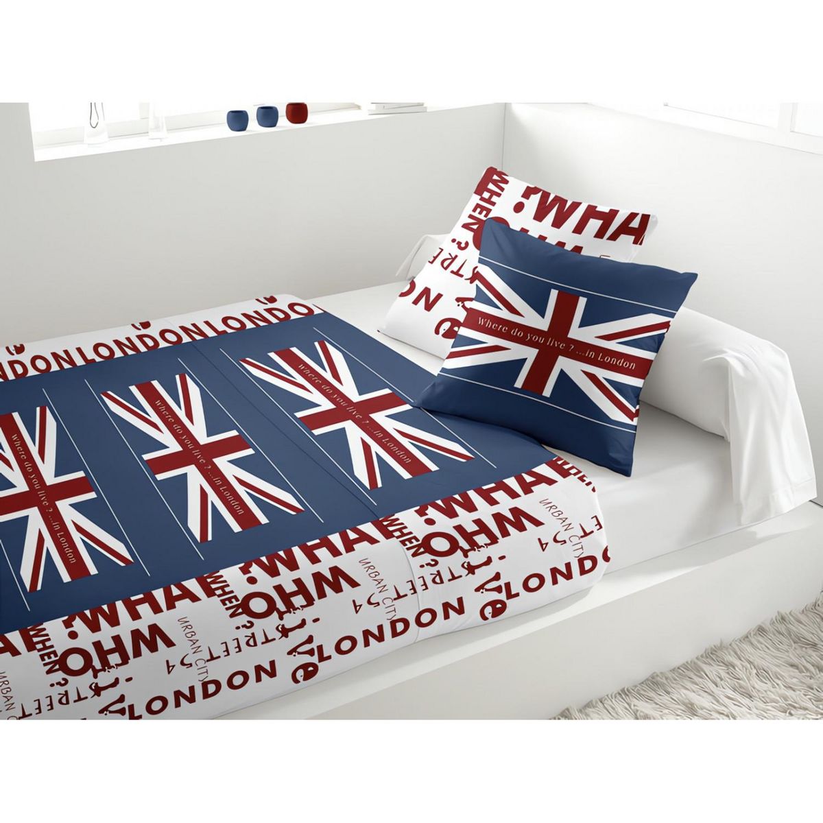 Très tendance ce drapeau union Jack, cette parure lit 2 personnes est composée de 5 pièces: - 1 drap plat 240x300 cm - 1 drap housse 140x190 cm avec bonnet de 25 cm - 2 taies d'oreiller 63x63 cm, dessin placé - 1 taie de traversin 45x185 cm Composition: 100% pur coton 57 Fils/cm2 Qualité supérieure, fibre naturelle