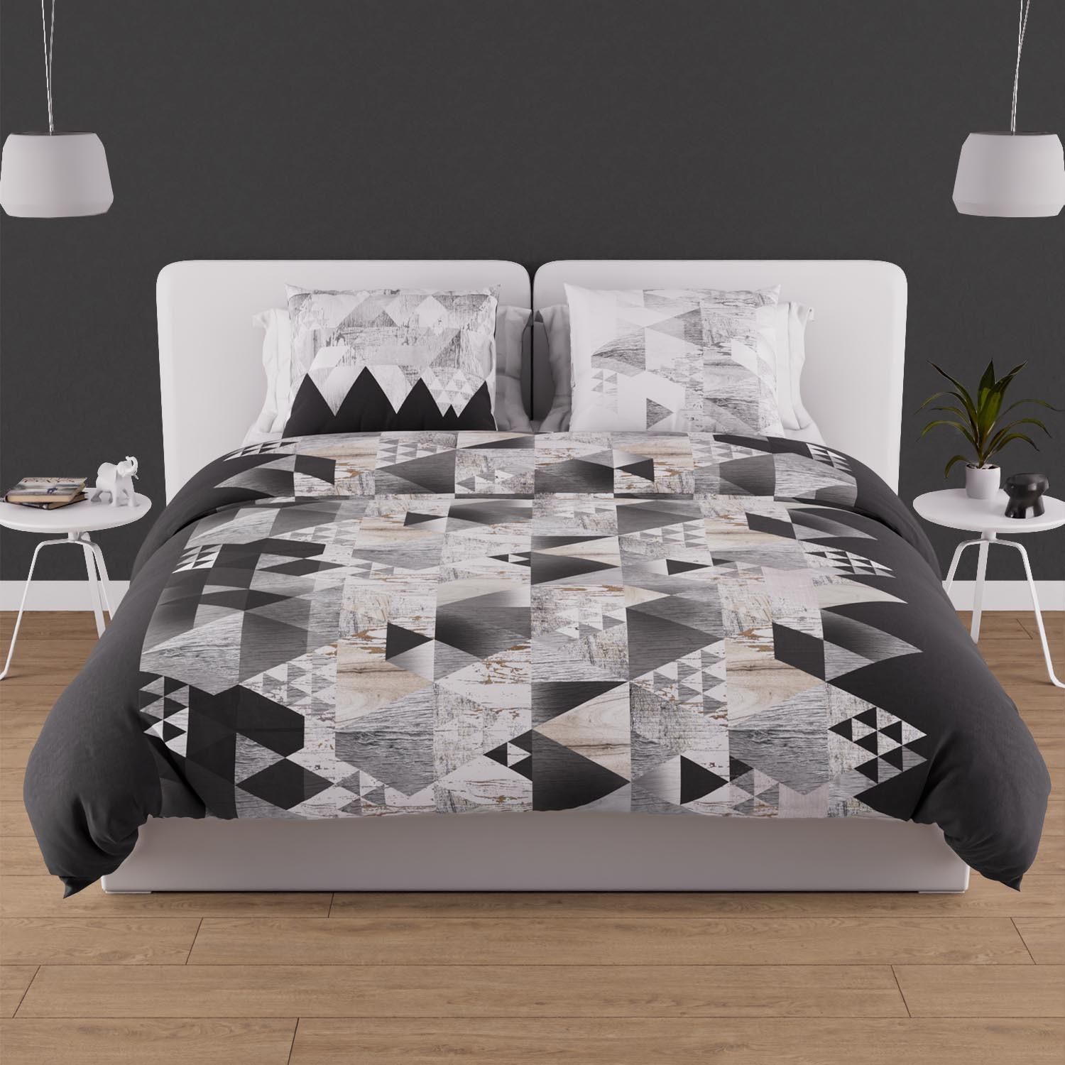 Linge de lit imprimé en pur coton pour grand lit 2 personnes. Qualité supérieure, tissage serré. Couleur: - Anthracite. Composition: - 100 % coton 57 fils/cm2. Parure de lit: - housse de couette: 220x240 cm avec rabat de 40 cm. - 2 taies d'oreiller dessin placé 63x63 cm. Entretien: - Entretien facile - Lavage 40° en machine