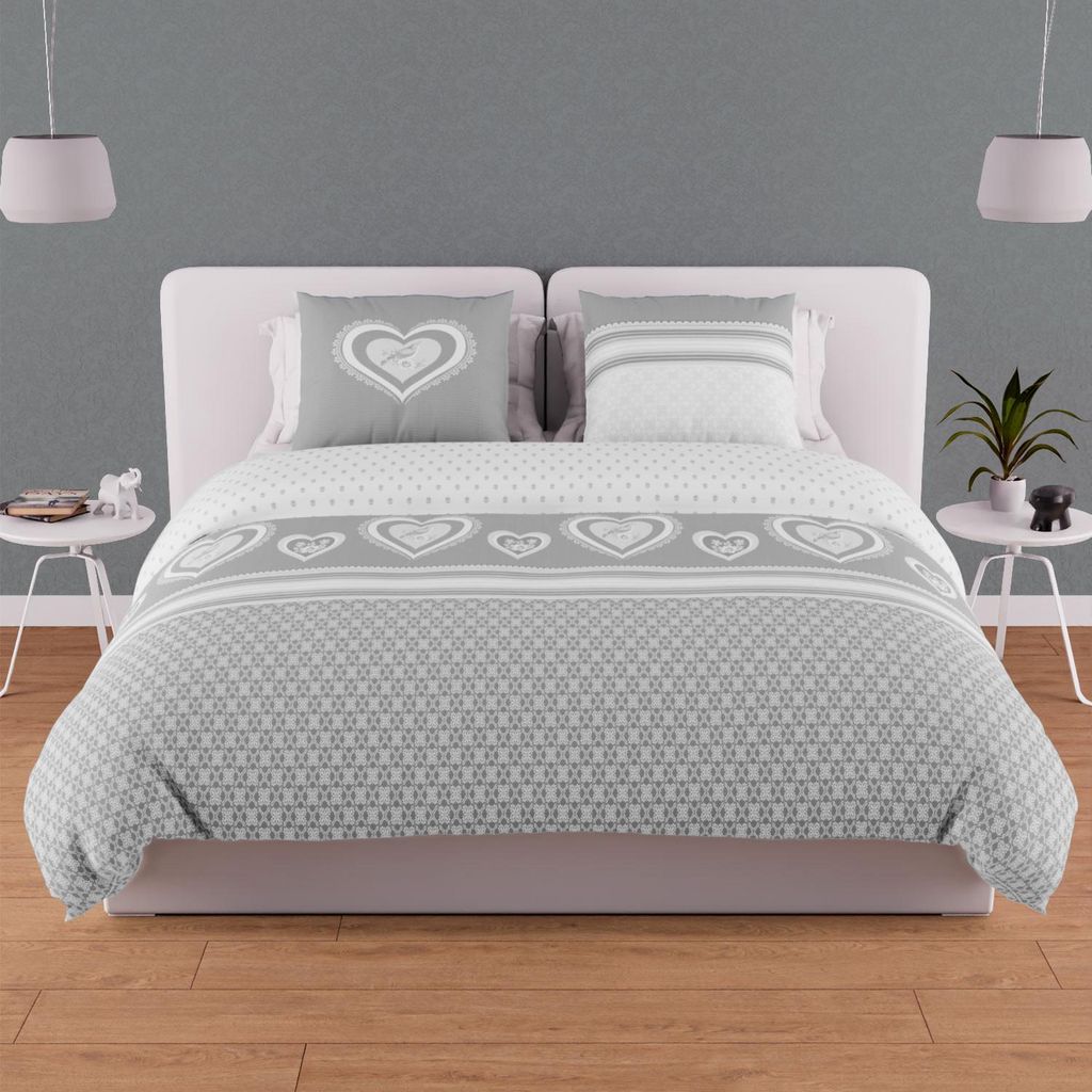 Linge de lit imprimé en pur coton pour lit 2 personnes. Qualité supérieure, tissage serré. Composition: - 100 % coton 57 fils/cm2. Parure de lit: 1 housse de couette avec rabat de 40 cm et 2 taies d'oreiller dessin placé 63x63 cm. Entretien: - Entretien facile - Lavage 40° en machine