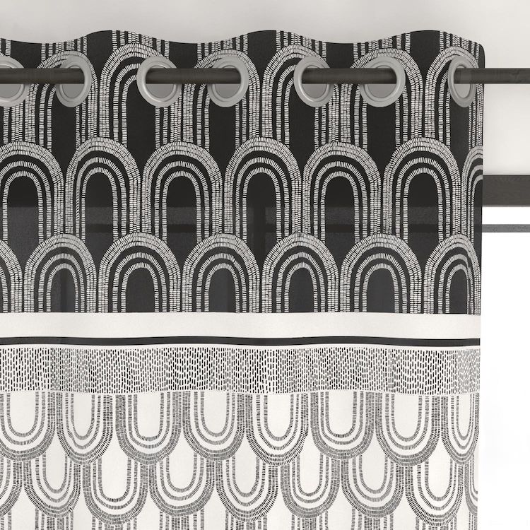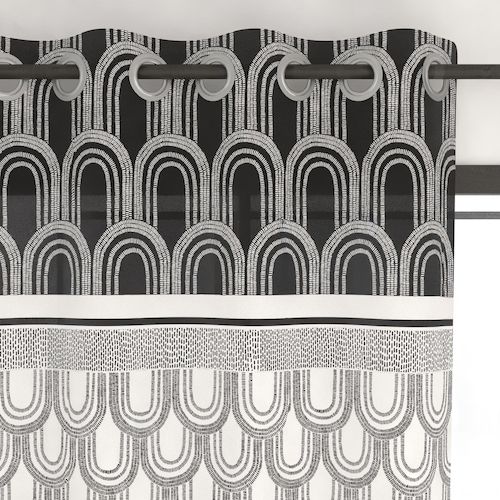 Une belle touche de modernité avec cette collection DUNE en polyester noir et blanc. Finition: 8 oeillets en métal inox (anti-rouilles). Prêt a poser. Couleur: Noir et blanc. Composition: 100% polyester. Dimensions: 135x250 cm. Entretien: - entretien facile, repassage inutile. - lavable en machine 30°c.