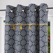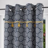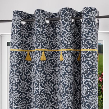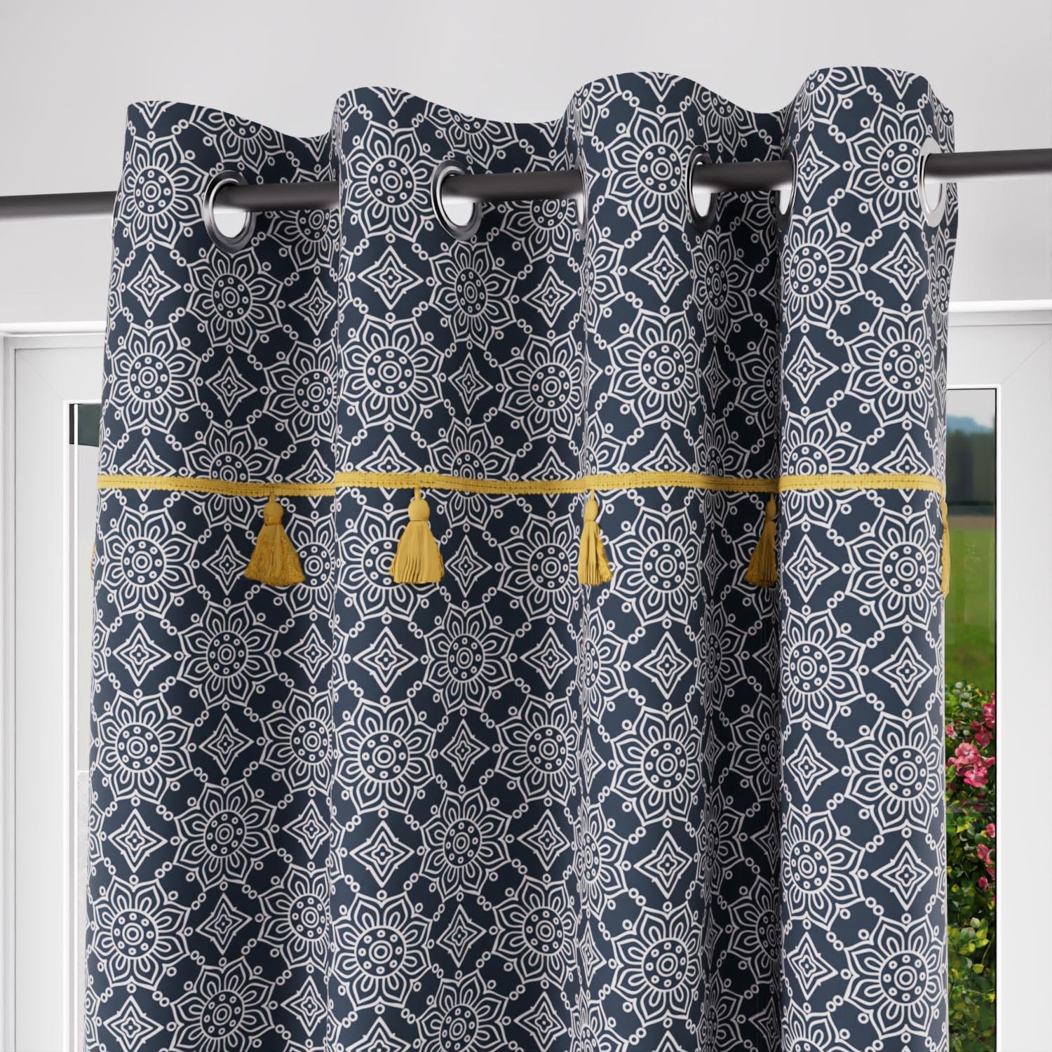 Ce rideau en pur coton, à l'imprimé géométrique très tendance, apportera modernité à votre intérieur. Finition: 8 oeillets en acier inox, anti-rouilles. Des pompons comme éléments décoratifs. Couleur: Gris bleuté, jaune et blanc. Composition: 100% coton. Dimensions: 135x250 cm. Entretien: Lavage à froid en machine.