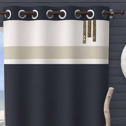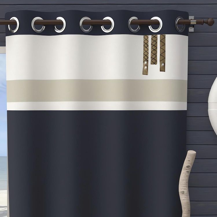 Laissez-vous embarquer par l'ambiance chic et contemporaine de cette collection ESPRIT MARIN. Elle promet de donner à votre intérieur une belle escapade. Finition: 8 oeillets en acier inox, anti-rouilles. 3 cordes brodées comme élément décoratif. Couleur: Bleu, blanc et taupe. Composition: 100% coton. Dimensions: 135x250 cm. Entretien: Lavage à froid en machine.