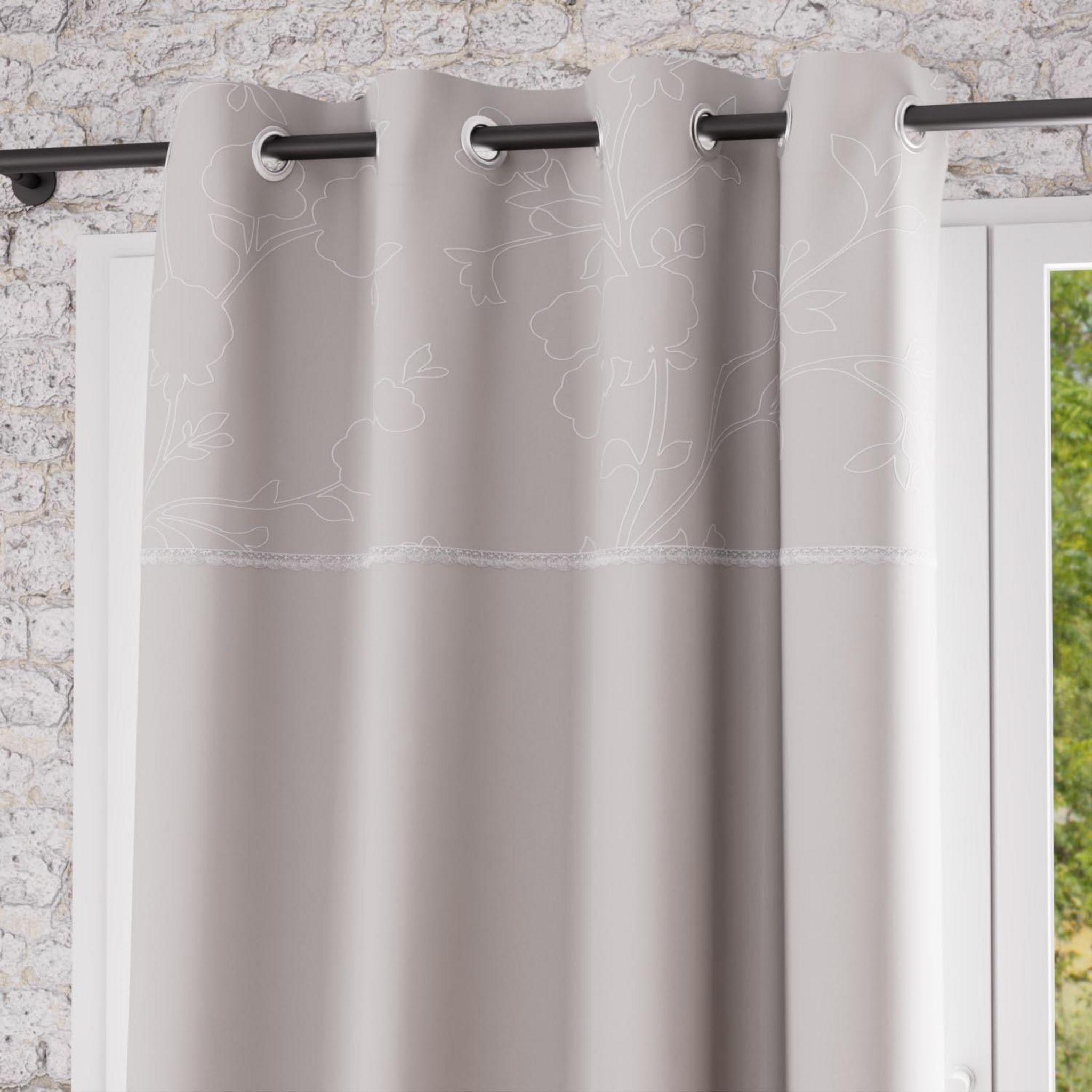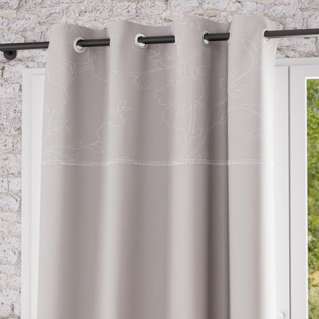Rideau à oeillets en pur coton avec broderie et dentelle pour un effet charme assuré!!! Finition: 8 oeillets métal inoxydables. Couleur: Taupe et blanc. Composition: 100 % coton. Dimensions: 135X250 cm. Entretien: Lavage en machine à froid.