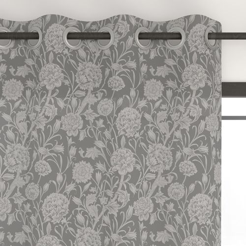 Cet imprimé fleural Dahlia en polycoton offrira élégance et sobriété à votre intérieur. Finition: 8 oeillets en métal inox (anti-rouilles). Prêt a poser. Couleur: Gris. Composition: 80% coton recyclé, 20% polyester Dimensions: 135x250 cm. Entretien: - entretien facile, repassage inutile. - lavable e