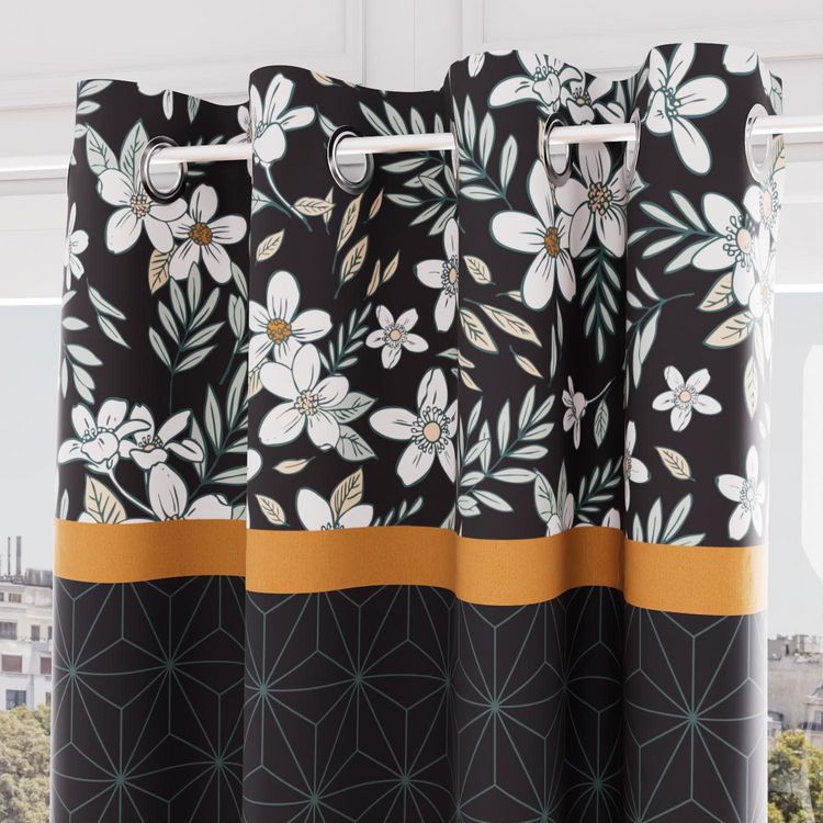 En savoir +Ce rideau en pur coton MANON, à l'imprimé fleural et géométrique très tendance, apportera modernité à votre intérieur. Finition: 8 oeillets en acier inox, anti-rouilles. Bande velours couleur ocre. Couleur: blanc, noir, bleu, ocre. Composition: 100% coton. Dimensions: 135x250 cm. Entretien: Lavage à froid en machine.