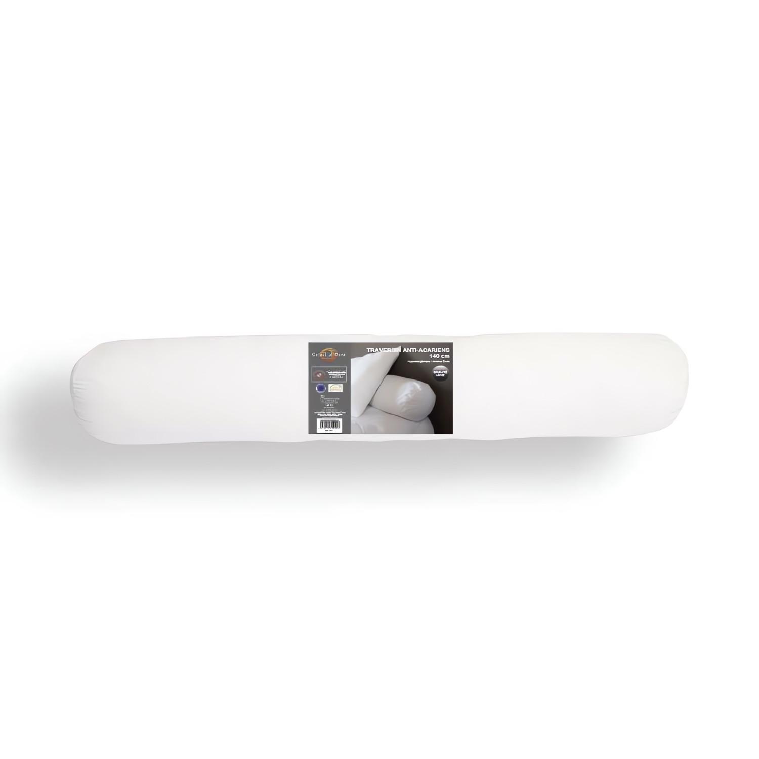 Traversin LUXE anti acarien. Haute résilience. Couleur: Blanc. Composition: enveloppe : 100% polyester microfibre 85 Gr/m2, garnissage: 100 % polyester fibre creuse siliconnée 900Gr. Lavable en machine Certification Oeko-Tex Fabrication européenne