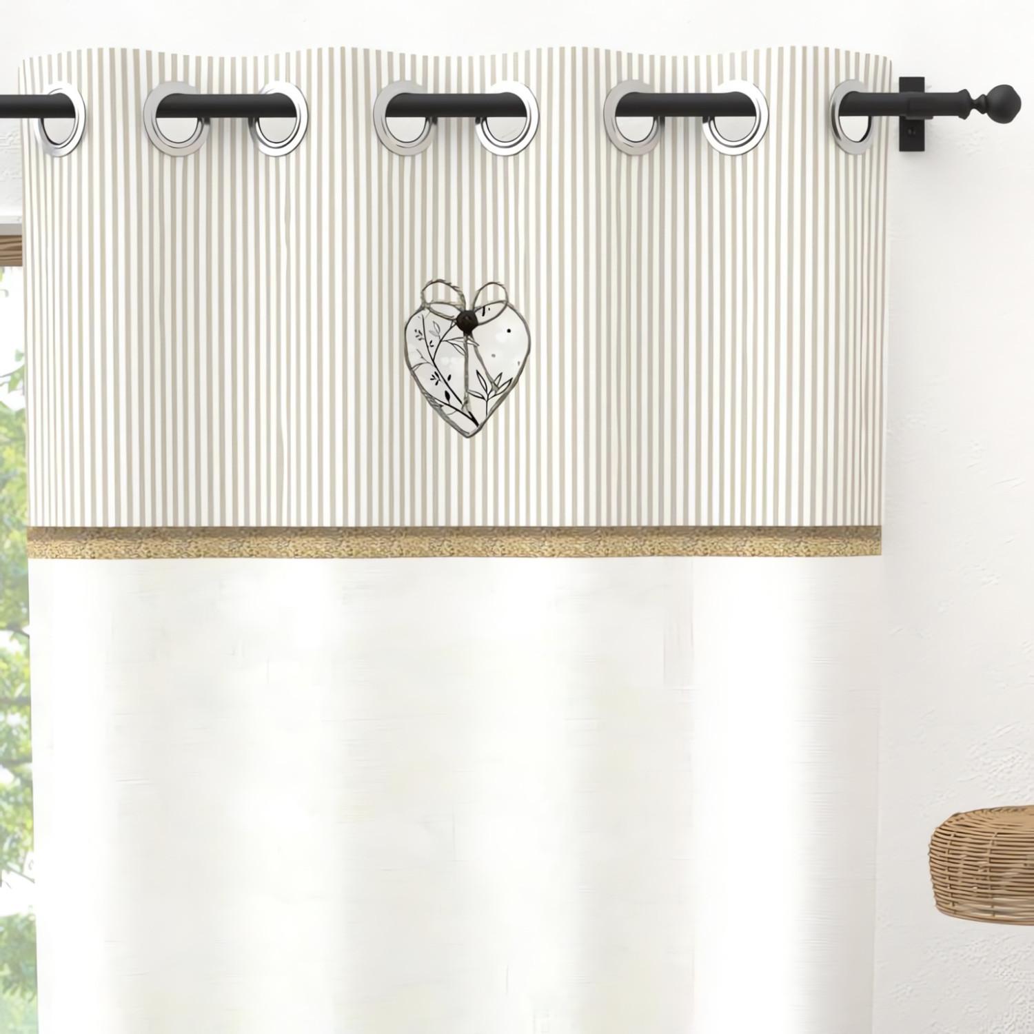 Cette collection AIMEE apportera du charme et de la modernité à votre intérieur. Finition: 8 oeillets en métal inoxydables. Patch en forme de coeur et ruban en jute comme éléments décoratifs. Couleur: Taupe. Composition: 100% coton avec bande de jute. Dimensions: 135X250 cm. Entretien: Lavage à froid en machine.