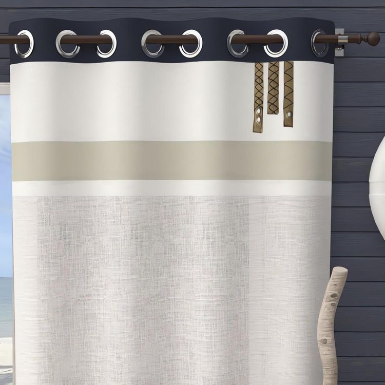 Laissez-vous embarquer par l'ambiance chic et contemporaine de cette collection ESPRIT MARIN. Elle promet de donner à votre intérieur une belle escapade. Finition: 8 oeillets en acier inox, anti-rouilles. 3 cordes en patch comme élément décoratif. Couleur: Bleu, blanc et taupe. Composition: 100% coton. Dimensions: 135x250 cm. Entretien: Lavage à froid en machine.