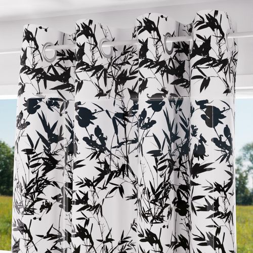 Voile en coton et parement en jute à l'imprimé feuillage très tendance. Finition: 8 oeillets en métal inoxydables. Couleur: Blanc, jute et noir. Composition: 100% coton avec bande de jute. Dimensions: 135X250 cm. Entretien: Lavage à froid en machine.