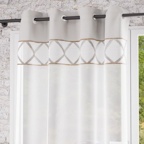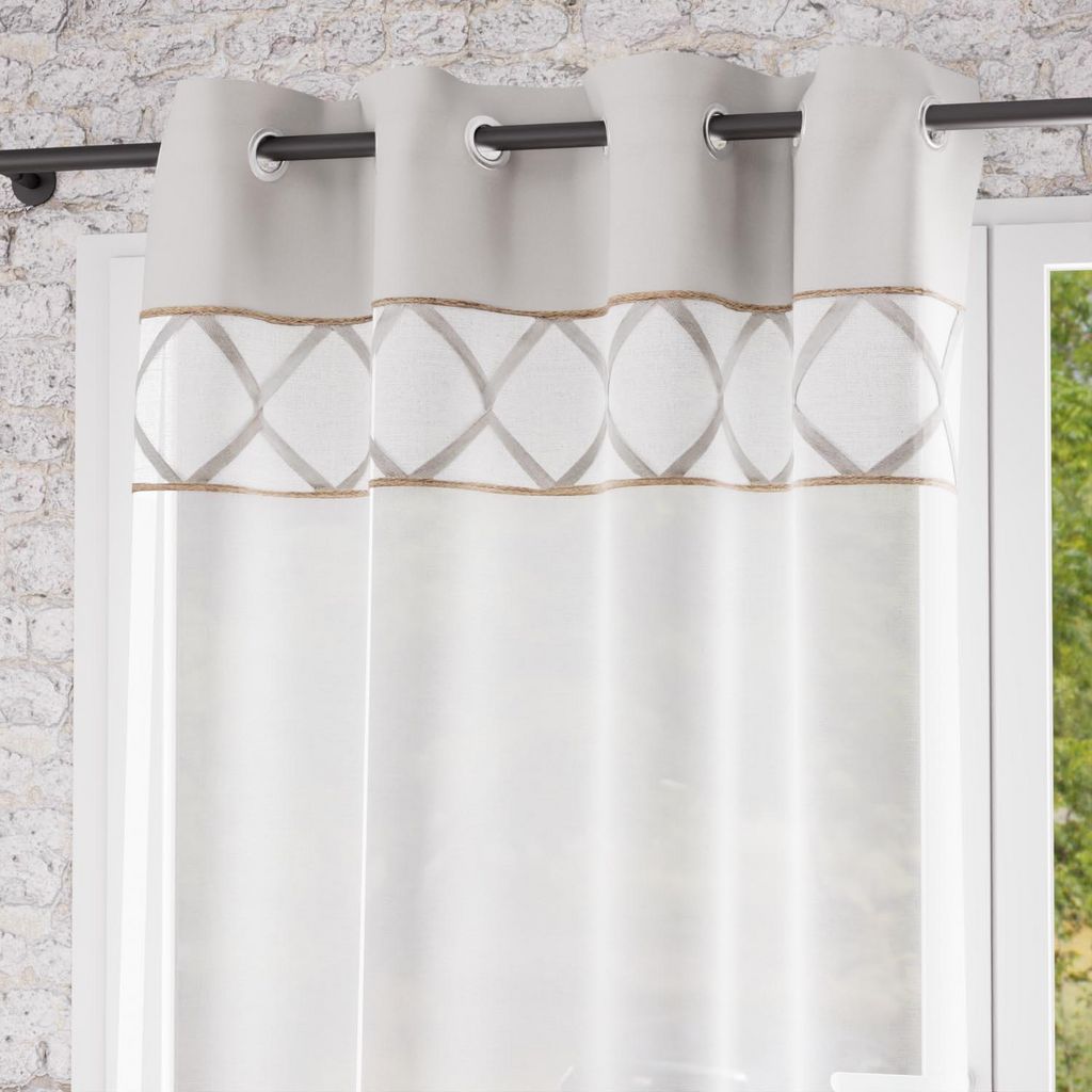 Cette collection Aude est idéale pour apporter douceur et charme à votre intérieur. Finition: 8 oeillets en métal inoxydables. Lacet en coton et biais en jute. Couleur: Blanc et gris. Composition: 100% coton avec bande de jute. Dimensions: 135X250 cm. Entretien: Lavage à froid en machine.