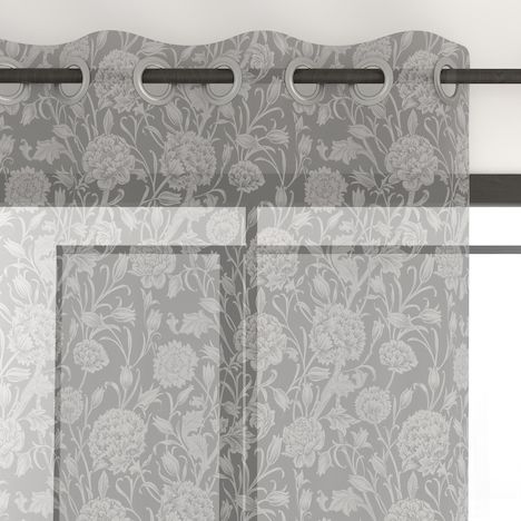 Cet imprimé fleural Dahlia en polycoton offrira élégance et sobriété à votre intérieur. Finition: 8 oeillets en métal inox (anti-rouilles). Prêt a poser. Couleur: Gris. Composition: 80% coton recyclé, 20% polyester Dimensions: 135x250 cm. Entretien: - entretien facile, repassage inutile. - lavable e