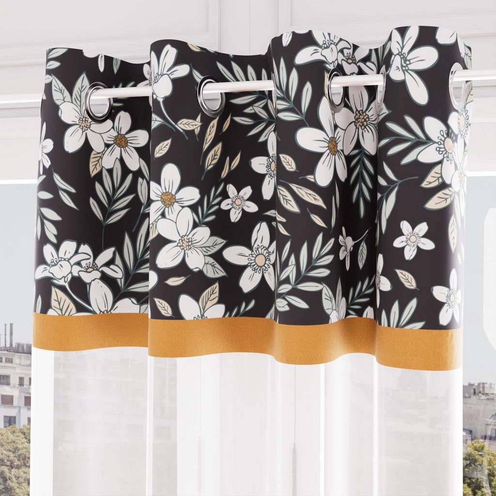 En savoir +Voilage à oeillets en coton, parement imprimé fleural. Finition: 8 oeillets en acier inox, anti-rouilles. Bande velours couleur ocre. Couleur: blanc, noir, bleu, ocre. Composition: 100% coton. Dimensions: 135x250 cm. Entretien: Lavage à froid en machine.