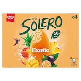 Découvre la glace bâtonnet Solero Fruits Exotiques et laisse-toi emporter dans un tourbillon de fraîcheur et de saveurs paradisiaques. La nouvelle gamme Solero t'invite à un voyage au cœur des saveurs tropicales ! Une glace vanille onctueuse, sublimée par des tourbillons de sauce aux fruits exotiques et enrobée d'un sorbet aux fruits exotiques pour une vague de fraîcheur irrésistible. Avec ses couleurs éclatantes et une recette élaborée à partir de purées et de jus de fruits, Solero Fruits Exotiques incarne la promesse d'un plaisir rafraîchissant. Seulement 98 kcal pour une escapade gourmande sans compromis ! Prépare-toi à savourer l'été, une bouchée à la fois. Disponible en pack de 4 glaces de 90 ml, à conserver à −18 °C pour préserver toute sa fraîcheur. Découvre aussi les autres parfums de la gamme : Fruits rouges & Fraise citron vert et les autres formats : les Minis et les bouchées glacées à partager ou pas… Solero, l'évasion gourmande et rafraîchissante. Réputée pour ses saveurs fruitées et son côté solaire depuis 1994, Solero incarne la fraîcheur et la légèreté des beaux jours. Avec ses couleurs éclatantes et ses textures onctueuses, Solero transforme chaque pause en un moment d'escapade estivale. Plus qu'une glace, Solero offre une expérience fruitée, alliant gourmandise, fraîcheur et onctuosité.