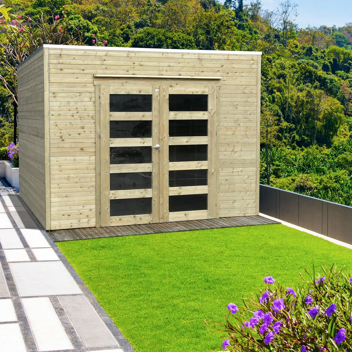 Cet abri de jardin en bois est traité autoclave afin d'être protégé des agressions biologiques (insectes - champignons) et ainsi de prolonger sa durabilité sera l'abri idéal pour votre extérieur. Avec une superficie intérieure de 8,01 m², il vous permettra de stocker vos outils de jardinage, tondeuse, vélo, poubelles et tout autre accessoire de plein air. Équipé d'une porte double dotée d'une poignée avec sécurité enfant et de fenêtres sécurisées, cet abri dispose également d'une ventilation intérieure afin de laisser l'air circuler et éviter tout problème d'humidité.