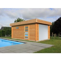 Le garage en bois Telfer a un look très contemporain. Il offre un large espace de pour garer votre véhicule et un accès facilité grâce à sa porte sectionnelle. Les parois sont en Sapin du Nord et d'une épaisseur de 40mm, donc très robuste. Une fenêtre latérale offre de la luminosité et la porte de service permet d'accéder facilement à l'intérieur lorsqu'une voiture y est garée. La toiture plate est en volige 16mm et recouverte de feutre bitumeux.