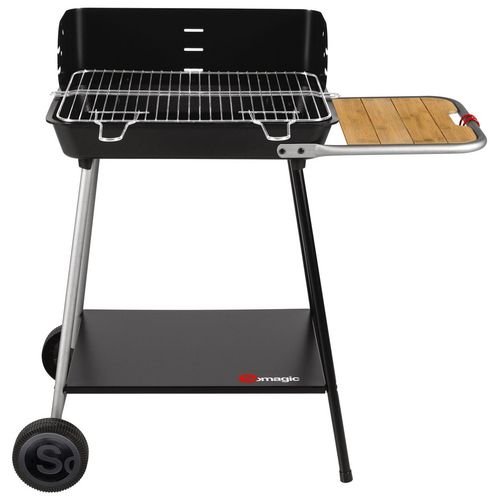 Cuve en fonte 54,5 X 38,5 cm Parevent en acier laqué avec hauteur de grille réglable Grille de cuisson en acier chromé 51 x 37,2 cm Chariot stable et robuste avec tablette latérale en bambou, plateforme de rangement et crochets porte-accessoires