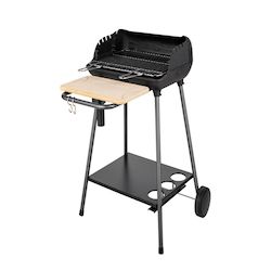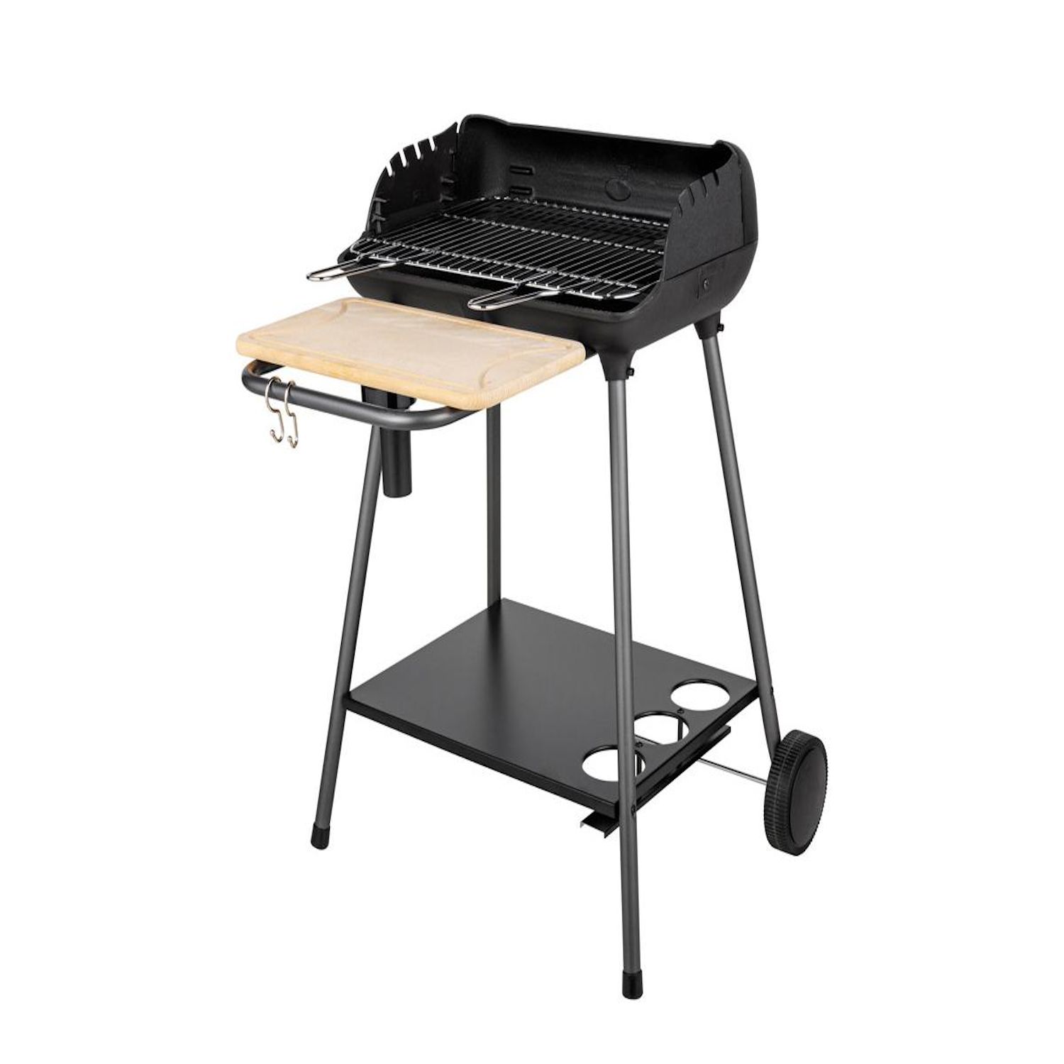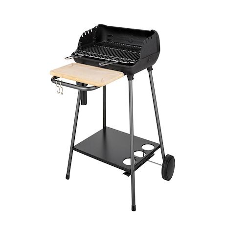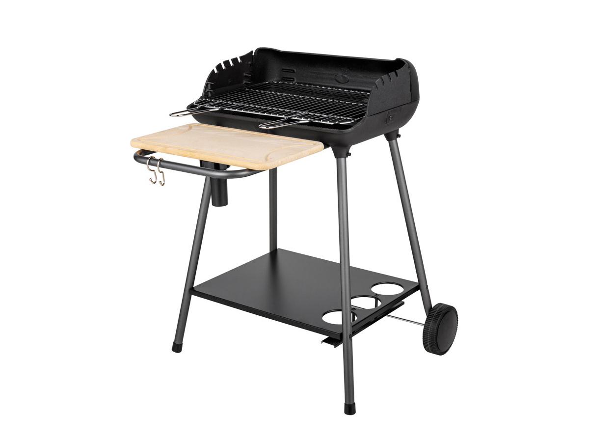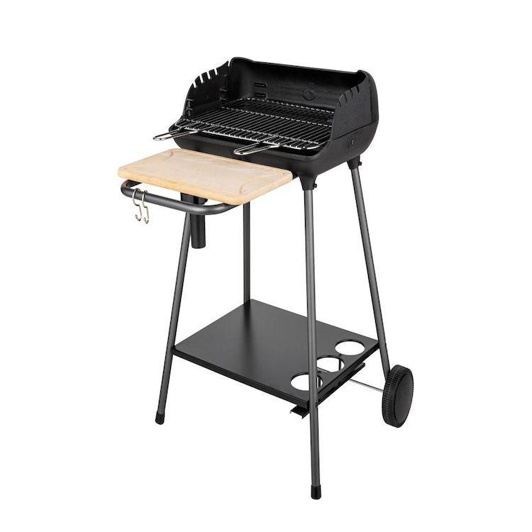 La grille de cuisson est en acier chromé 51 x 37 cm et la hauteur de grille est réglable. Le chariot est stable et robuste avec tablette frontale amovible en bois et la plateforme de rangement.