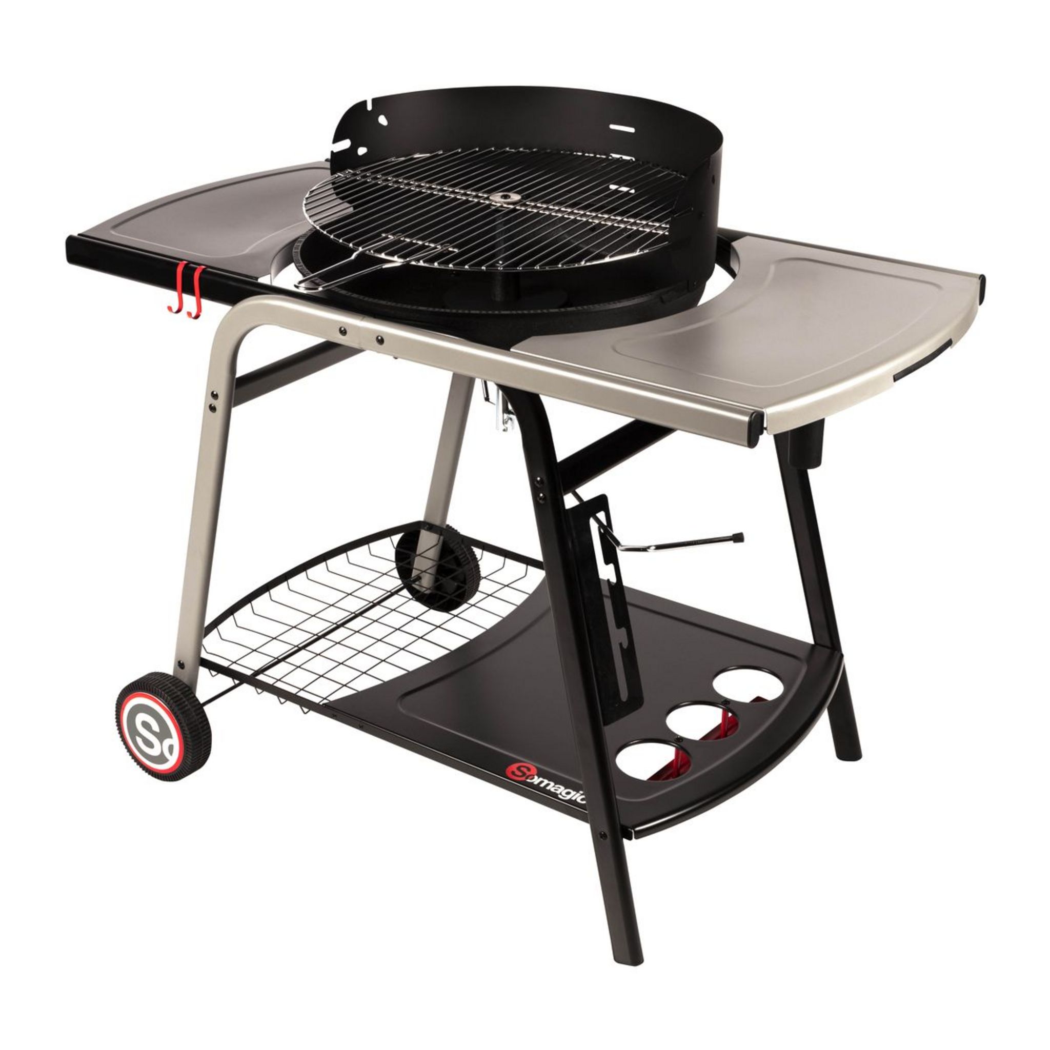 Ce barbecue charbon de bois possède une cuve en fonte avec un diamètre de 53cm. Il est muni d'un paravent en acier laqué avec hauteur de grille réglable vous permettant de protéger votre barbecue et votre cuisson du vent. La grille de cuisson mesure 50,8cm. Elle est pivotante et réglable en hauteur pour un réglage maximale au grès de vos envies et besoins. Un système de soufflerie est intégré à votre barbecue charbon de bois pour vous permettre de réguler au mieux votre cuisson. Ce barbecue charbon de bois est positionné sur un chariot pour être à a bonne hauteur lors de la cuisson. Mais possède également des tablettes latérales, une plateforme de rangement avec panier porte bouteilles et des crochets ports accessoires, très pratique pour tout avoir à porter de main et profiter de vos invités.