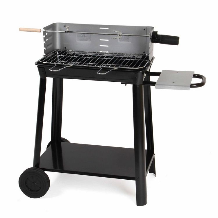 Barbecue charbon de bois avec cuve en acier de 52x30 cm. Paravent avec hauteur réglable. Grille de cuisson en acier chromé 49x28 cm. Chariot avec tablette latérale et plateforme de rangement. Livré avec tournebroche motorisé : idéal pour cuisson de volaille.