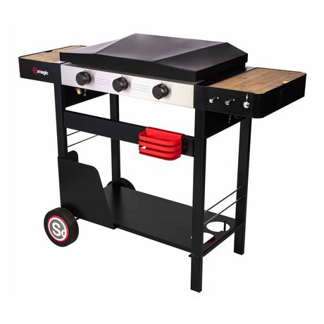 Cette plancha à gaz est positionné sur un chariot avec 2 roues pour une utilisation en extérieur et un déplacement facile. Cette plancha à gaz 3 brûleurs vous apportera un moment conviviale dans votre jardin ou sur votre terrasse. Le chariot possède des tablettes latérales en bambou, une plateforme de rangement avec 2 rangements pour bouteilles et un panier porte-épices pour tout avoir à porter de main lors de la cuisson. La grande surface de cuisson en fonte émaillée mesure 61,5 x 36,5 cm.